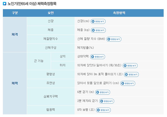 체력측정 항목의 경우에는 청소년기(만 13세~18세), 성인기(만 19세~64세), 노인기((만 65세 이상)으로 나누어지며, 연령별 측정항목은 아래와 같습니다.