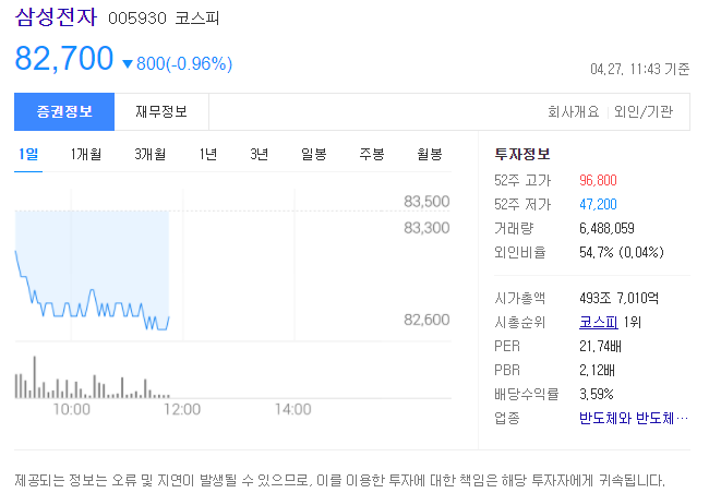 삼성전자의 주가는 21.04.27. 11:43 기준 82,700원입니다.
